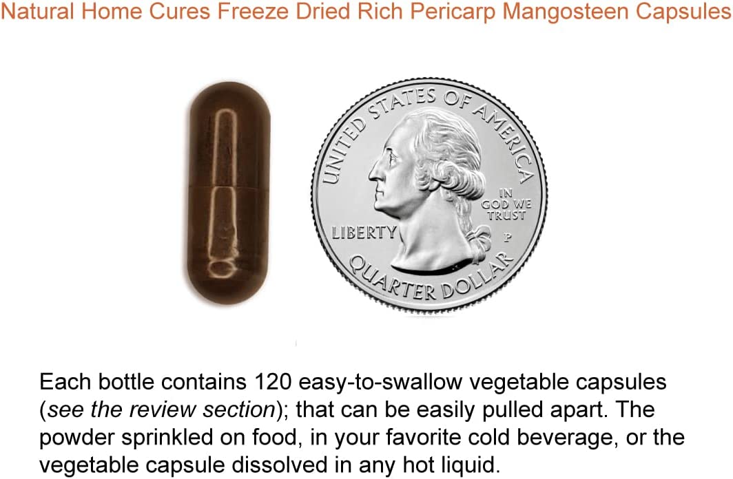 Our Natural Home Cures Freeze Dried Rich Pericarp Mangosteen comes in 120 capsules per bottle with 515 mg of mangosteen per capsule. To equal one capsule of Natural Home Cures Freeze Dried Mangosteen, you must drink 72 ounces of Company X's juice at $105. With Company V, you would need 8 ounces of juice at $8.50.